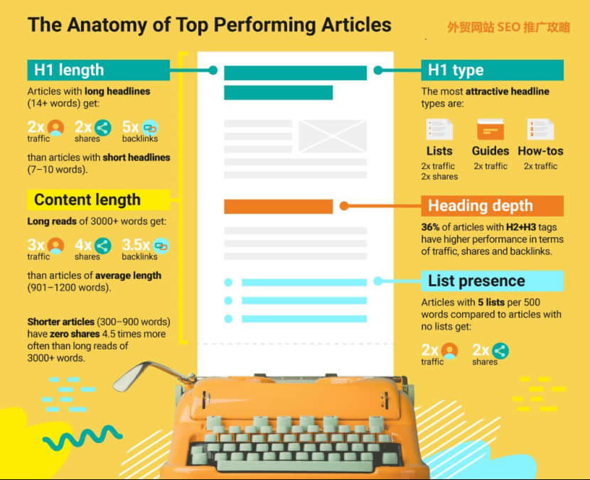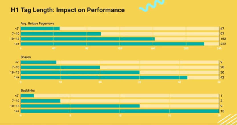 至關重要結果:與短題目(7-10個英語單詞)對比,長H1題目(14個英語單詞上下)的文章內容均值會得到:2倍的總流量、2倍的共享、5倍的反鏈。