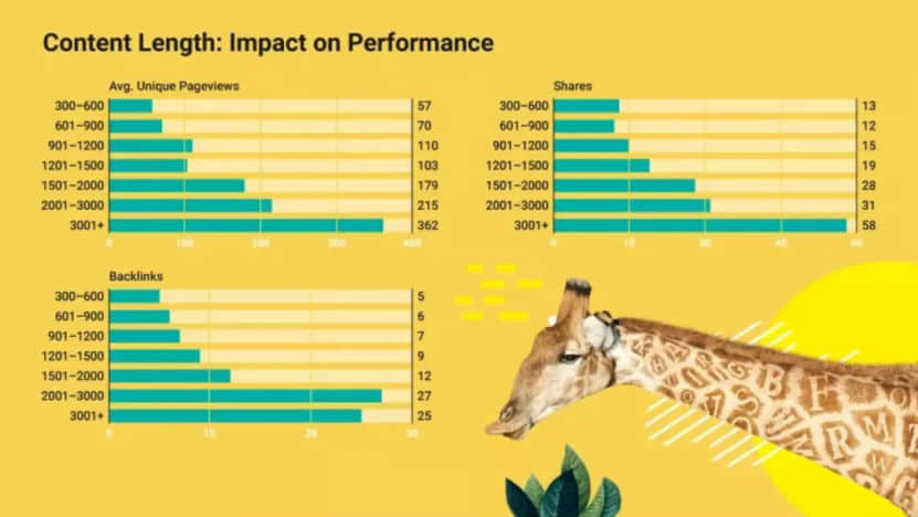 至關重要結果:與平均長度901-1200字的文章內容對比,長篇小說內容(超出3000字)有:3倍的總流量,4倍的社交媒體共享,3.5倍的反鏈。